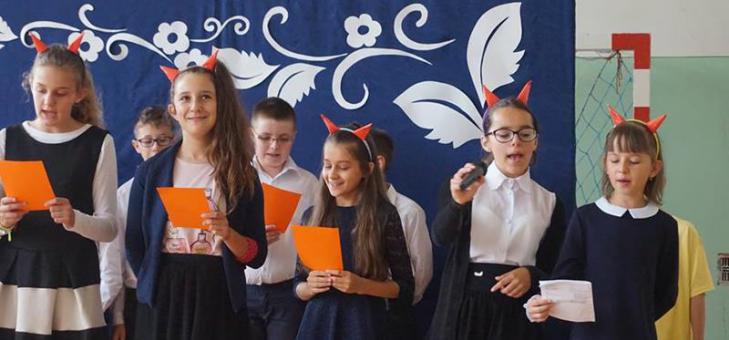 Następnie uczniowie wraz z rodzicami i wychowawcami pod przewodnictwem Pocztu Sztandarowego udali się do budynku szkoły. Część artystyczną zaprezentowała klasa szósta przygotowana przez wychowawczynię – Agnieszkę Bednarz. Szóstoklasiści z szerokim uśmiechem na twarzach przypominali smaki i zapachy wakacji. Odgrywali humorystyczne scenki, tańczyli nawet w rytm piosenek disco polo. Witając pierwszoklasistów i nowych nauczycieli w Gronie Pedagogicznym, jasno podkreślili, że do naszej szkoły nie chodzą anioły, ale panuje tu zawsze miła i sympatyczna atmosfera.