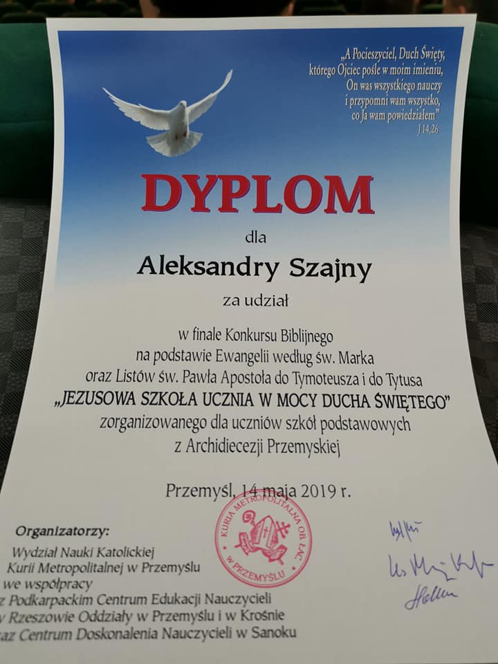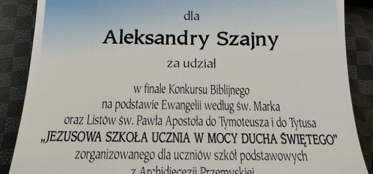 15 maja w Wyższym Seminarium Duchownym w Przemyślu odbył się finał diecezjalny Konkursu Biblijnego „Jezusowa szkoła ucznia w mocy Ducha Świętego”. Dekanat Miejsce Piastowe reprezentowało troje uczniów a wśród nich uczennica naszej szkoły Aleksandra Szajna. Serdecznie gratulujemy.