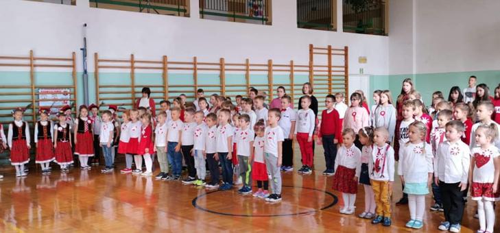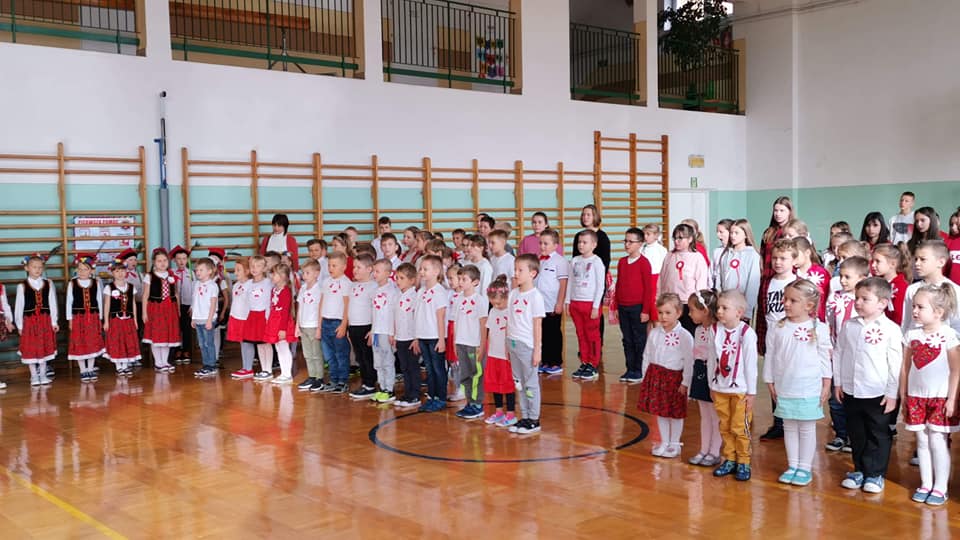 Niemal w przeddzień obchodów Swięta Niepodległości, 8 listopada, punktualnie o 11.11 wszyscy uczniowie Szkoły Podstawowej im. T. Kościuszki odśpiewali wszystkie 4 zwrotki hymnu państwowego w ramach akcji "Szkoła do hymnu". Uroczystości towarzyszyły tańce krakowiaków z klasy I oraz taniec z flagami w wykonaniu uczennic z klasy V. Zwieńczeniem uroczystości było wspólne zdjęcie z flagą Polski.