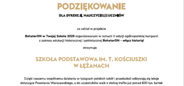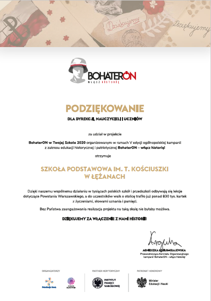 Po raz kolejny otrzymaliśmy podziękowanie za zaangażowanie zarówno uczniów i nauczycieli naszej szkoły w ogólnopolskiej akcji BohaterON - włącz historię. ...
