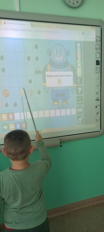 na tablicy multimedialnej. Później przyszedł czas na kodowanie na dywanie. To była ciekawa lekcja kodowania.