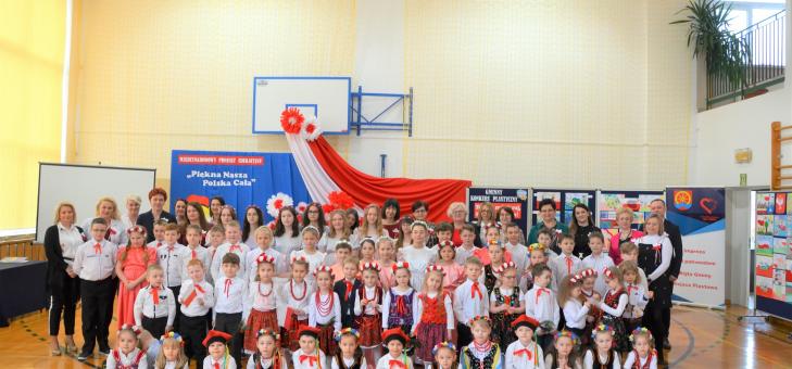 Przedszkolaki zaprezentowały się śpiewając całym dziecięcym serduszkiem piosenki o Polsce, recytując i tańcząc skocznego Krakowiaka. Uczniowie klasy III z niezwykłą gracją i elegancją zatańczyli przepięknego Poloneza. Po nich wystąpiła sekcja muzyczna w piosence zagranej na fletach „Płynie Wisła płynie”, a następnie uczennice klasy VII wykonały taniec z flagami. Na koniec cała szkoła wspólnie przystąpiła do ostatniego zadania - zaśpiewała piosenkę projektową „Piękna nasza Polska cała”.