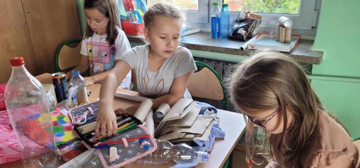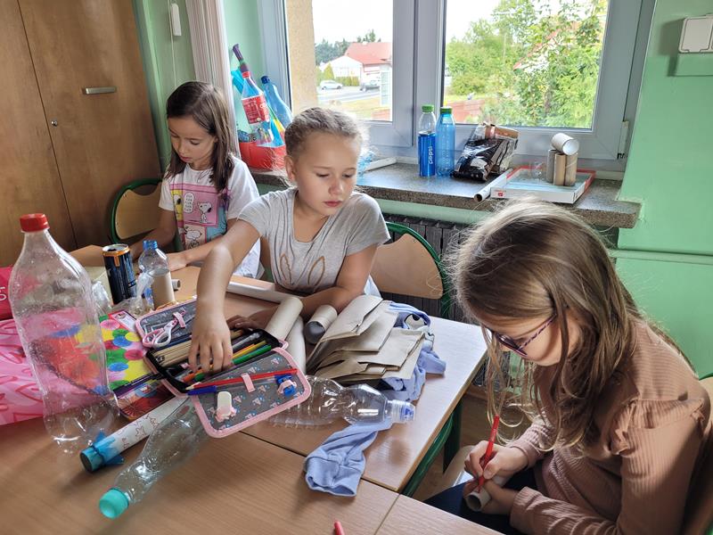 W ostatnim tygodniu września dzieci uczęszczające na zajęcia świetlicowe w naszej szkole „założyły” mały zespół wokalno – instrumentalny. Do „koncertu” wykorzystały wykonane przez siebie ekoinstrumenty jak: bębenki z tekturowych pudełek po chusteczkach, plastikowych pudełek po sałatkach, kubeczków, rolek po papierze toaletowym lub nadmuchanych balonów, a pałeczki ze zużytych długopisów czy tekturowych rolek po folii do żywności. Z tych ostatnich, worka nylonowego i gumek recepturek wyszły piękne grzechotki, oczywiście po wypełnieniu ich ziarnami grochu, ryżu lub kaszy. Kreatywne Świetliki z długich rolek zrobiły nawet flety. Plastikowe butelki dostały nowe zastosowanie i posłużyły również jako grzechotki. Świetnym materiałem na gitary były tekturowe pudełka, gumki recepturki jako struny i tekturka na gryf. Dzieciom nie brakowało pomysłów.