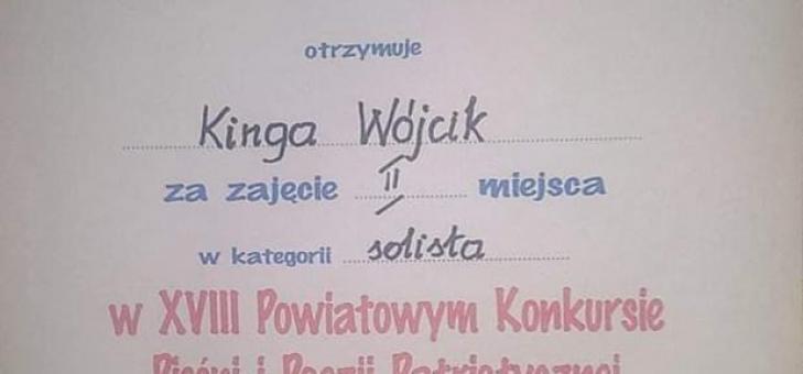 Tym razem zajęła II miejsce w kategorii solista w Powiatowym Konkursie Pieśni i Poezji Patriotycznej zorganizowanym pod patronatem Prezydenta Miasta Krosna. W konkursie w kategorii recytacja brała też młodsza siostra Kingi, Milena zaprezentowala piękną interpretacjw wiersza K. I. Gałczyńskiego "Pieśń o fladze".
