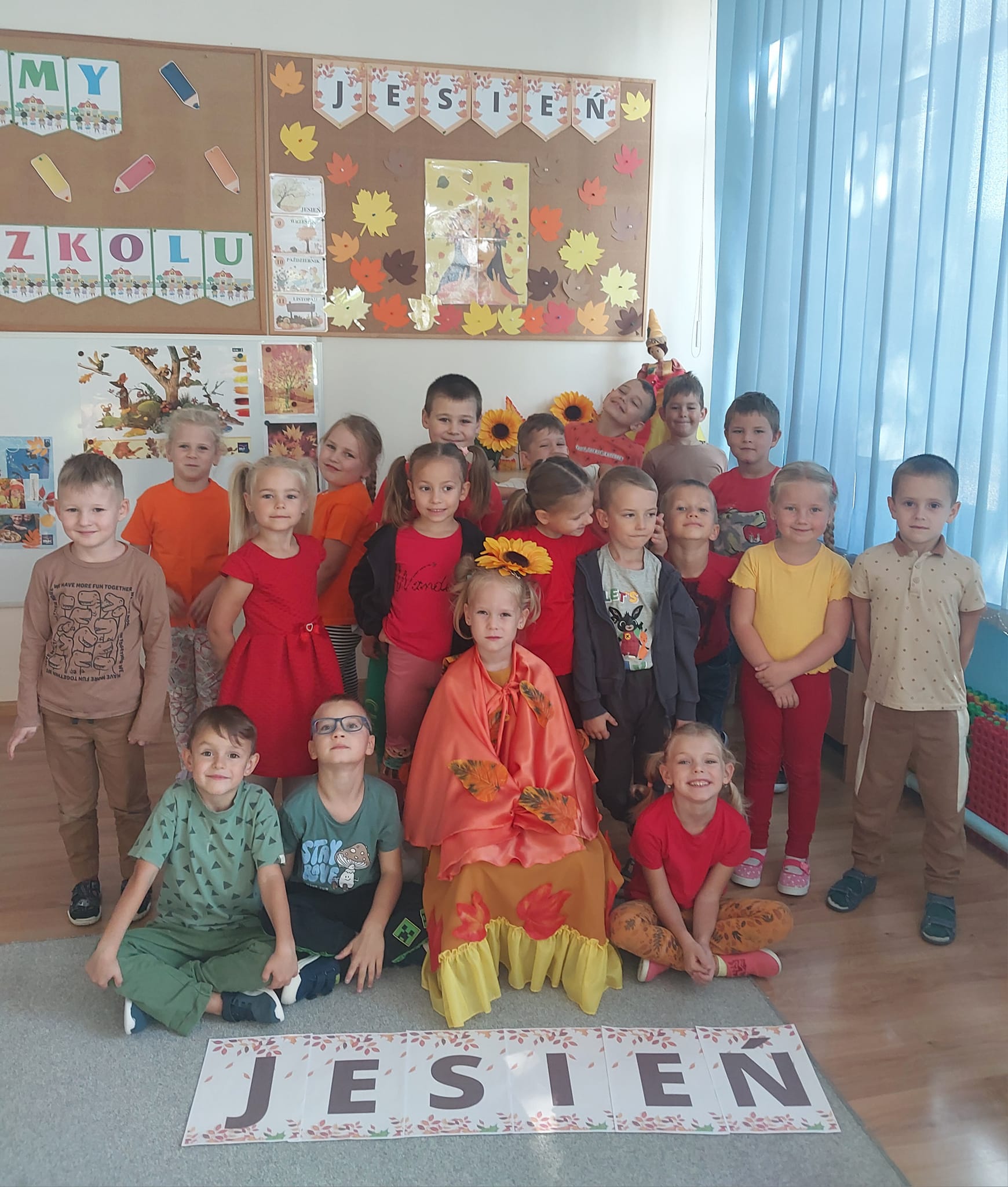 Przedszkolaki oficjalnie powitały Panią Jesień, która przybyła do wszystkich grup niosąc kosz pełen darów. Dzieci wraz z rodzicami od kilku dni przynosiły żołędzie, kasztany, piękne liście, szyszki i orzechy. Podczas zajęć wykorzystały zgromadzone skarby do liczenia i układania rytmów. Przy skocznej piosence spróbowały swych sił i ćwiczyły stópki przechodząc ścieżką sensoryczną. Nie zabrakło również jesiennego spaceru, na którym obserwowany zmiany zachodzące w przyrodzie, poznawały drzewa po liściach i nasionach, a nawet znalazły maślaczka. Wszystkie przedszkolaki bardzo lubią ciepłe jesienne słońce .