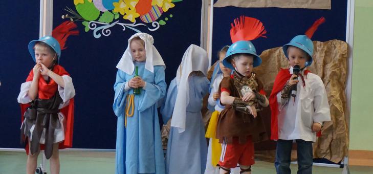 W środę 12.04. uczniowie naszej szkoły zgromadzili się na górnym korytarzu. Obejrzeli inscenizację "Jezus żyje, z grobu wstał, wszystkim wieczne życie dał" przygotowaną przez 4-5 latki. „Wielkanocne tradycje” przybliżyło kółko teatralne z kl. II pod kierunkiem pani Renaty Strączek.