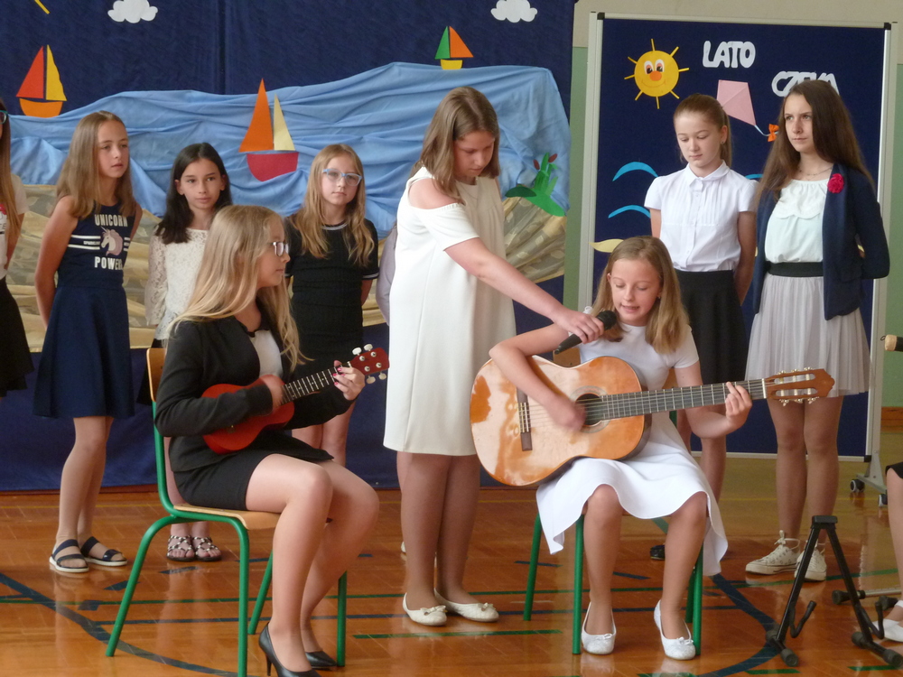 Harcerze szkoły podstawowej przygotowali akademię z okazji zakończenia roku szkolnego. Były piosenki, scenka rodzajowa o szkolnych aniołach. Z instrumentami zaprezentowali się: Weronika Szelc - instrumenty klawiszowe i ukulele, Alicja Mercik, gitara klasyczna, Aleksandra Babczyńska - tamburino. W występ włączyły się uczennice klasy 3.