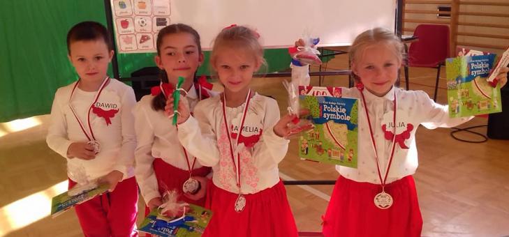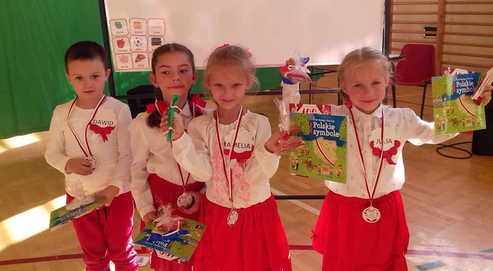 Dnia 7 XI 2018 r. reprezentacja 6-latków uczestniczyła w spotkaniu integracyjnym pod hasłem „Mali Patrioci- Wiwat Niepodległa” w Szkole Podstawowej w Rogach. Podczas spotkania dzieci miały okazję poznać swoich rówieśników z innych przedszkoli w Gminie Miejsce Piastowe. Obejrzały inscenizację poświęconą 100- letniej Rocznicy Odzyskania przez Polskę Niepodległości, wspólnie zaśpiewały Mazurek Dąbrowskiego. W zespołach wykonywały ciekawe zadania związane z patriotyzmem: układały puzzle, rozwiązywały zagadki, rozpoznawały sylwetki Wielkich Polaków. Każdy uczestnik spotkania otrzymał pamiątkowy medal i dyplom. Podczas wspólnych zabaw dzieci świetnie się porozumiewały, rozwinęły umiejętność pracy zespołowej, a przede wszystkim na własny sposób uczciły 100- letnią Rocznicę Odzyskania przez Polskę Niepodległości! Dziękujemy organizatorom za zaproszenie!