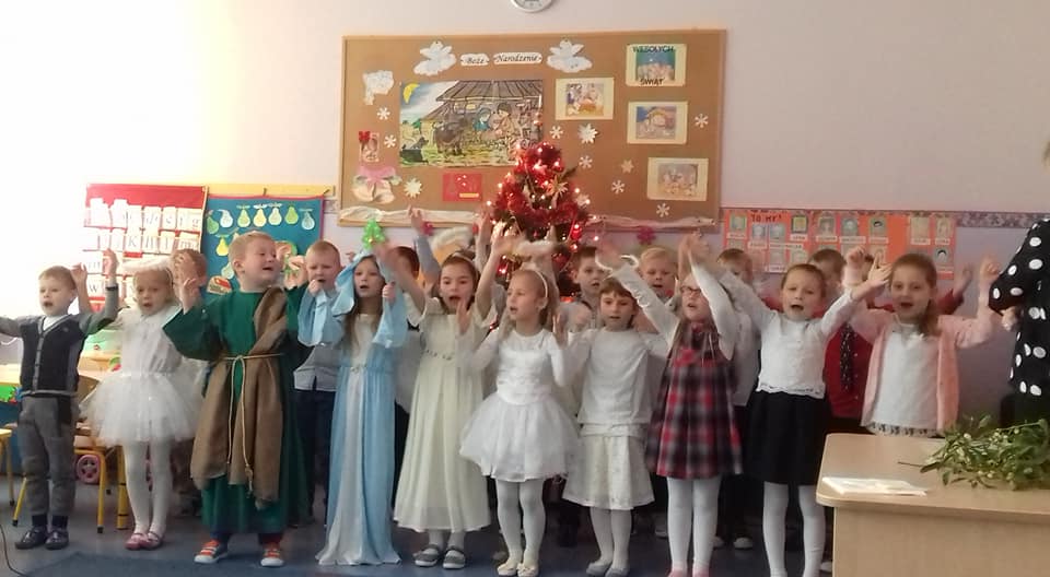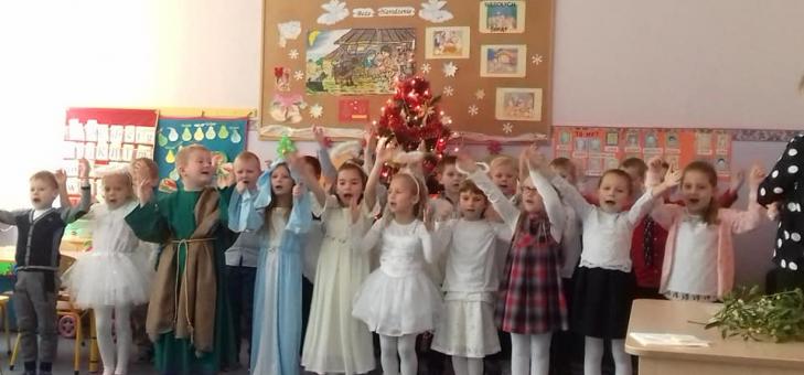 Dzieci 6- letnie zaprezentowały krótką scenkę wprowadzającą w atmosferę świąt Bożego Narodzenia. Potem były życzenia, łamanie się opłatkiem oraz wspólny obiad z zaproszonymi gośćmi.