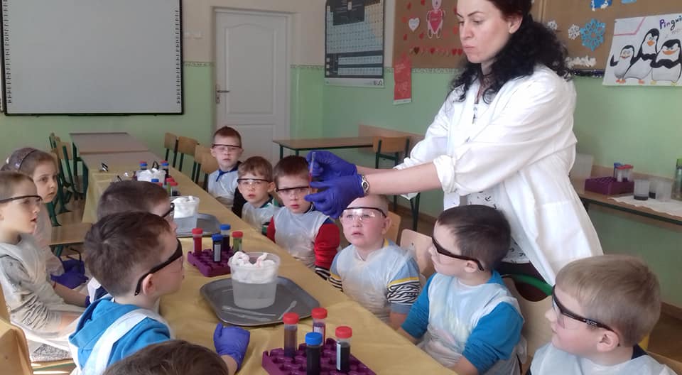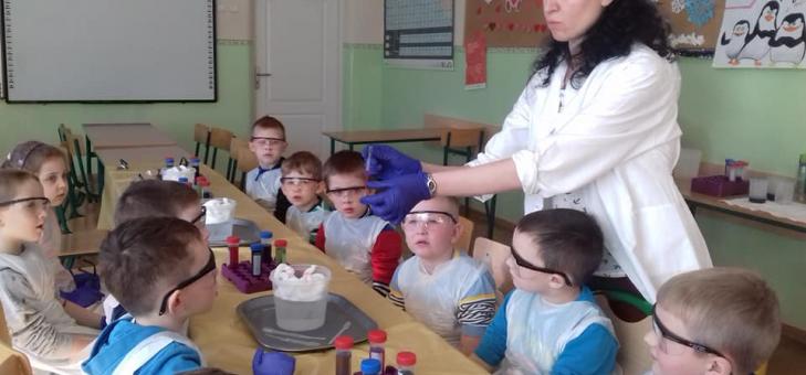 W czwartek, 7 lutego dzieci 5 i 6- letnie uczestniczyły w warsztatach chemicznych. Na początku każde dziecko otrzymało zestaw małego chemika: fartuch ochronny, rękawiczki i okulary. Wszyscy z dużym zainteresowaniem wysłuchali pani prowadzącej, która wyjaśniła na czym będą polegały zajęcia. Następnie dzieci samodzielnie wykonywały doświadczenia, wyczarowując przepiękną tęczę z cukierków oraz kolorowy deszcz. Podsumowaniem zajęć były zagadki, z którymi maluchy świetnie sobie poradziły. Za udział w zajęciach wszystkie dzieci otrzymały niespodzianki: fartuchy, rękawiczki i pipety. Zajęcia były bardzo ciekawe i nawet po ich zakończeniu wzbudzały u dzieci dużo emocji !