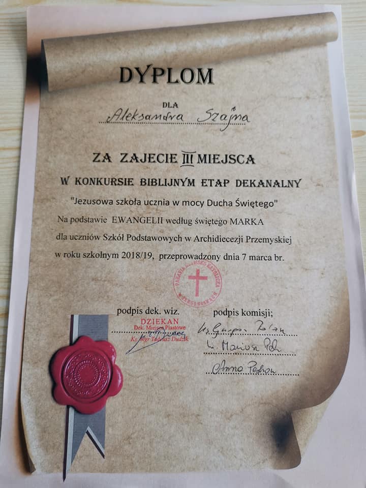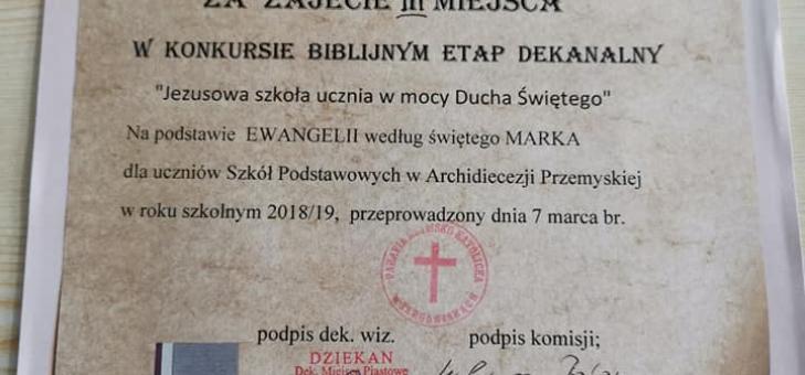 7 marca Aleksandra Szajna i Oliwia Hejnar - uczennice klasy VI uczestniczyły w Dekanalnym Konkursie Biblijnym, który odbył się w szkole w Lubatówce. Aleksandra Szajna zakwalifikowala się do Diecezjalnego Etapu Konkursu Biblijnego, który odbędzie się 14 maja w Przemyślu w Wyższym Seminarium Duchownym. Serdecznie gratulujemy i życzymy dalszych sukcesów.