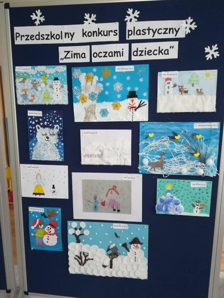 Dnia 25 lutego odbył się przedszkolny konkurs plastyczno-muzyczno-recytatorski pod hasłem ,,Zimo baw się z nami”. Celem konkursu było wyrabianie wrażliwości na piękno języka polskiego, rozwijanie zdolności artystycznych, pobudzanie dzieci do aktywnego uczestnictwa w życiu przedszkola oraz wzmacnianie poczucia własnej wartości. Przedszkolaki z wielka odwagą i entuzjazmem recytowały wiersze związane z tematyką zimową i pięknie śpiewały piosenki, pt.: ,,Tupu, tup po śniegu” oraz ,,Biały walczyk”. W ramach konkursu zorganizowana została również wystawa prac plastycznych. Młodzi artyści wykazali się dużą pomysłowością, prezentując różnorodne techniki wykonania swoich prac, które były malowane kredkami, flamastrami, wyklejane, a także tworzone przy użyciu, m. in. pasty do zębów, czy też waty kosmetycznej i wielu innych oryginalnych materiałów. Dzieci zostały nagrodzone dyplomami, a także upominkami. Gratulujemy wszystkim uczestnikom konkursu!