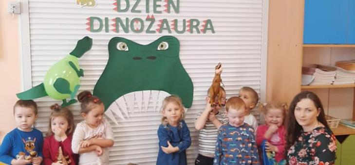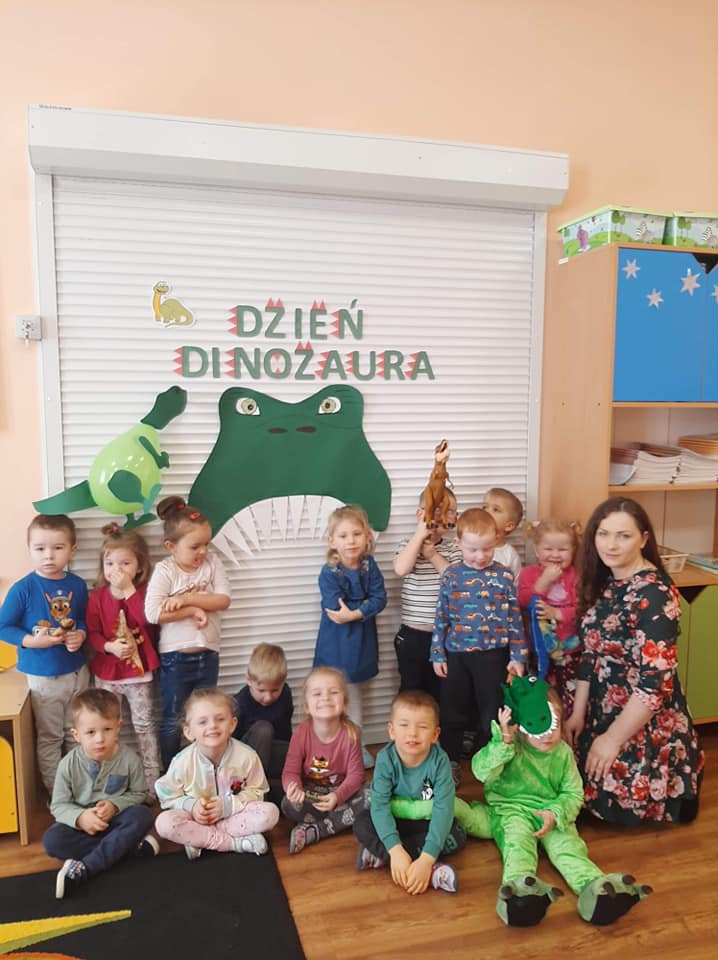 Dnia 26 lutego przedszkolną salę wypełnili prehistoryczni goście. Duże, małe, głośne i całkiem ciche, latające i ciężko stąpające - dinozaury. Tę przygodę z dinozaurami rozpoczęliśmy od krótkiego filmu opowiadającego o tych niezwykłych stworzeniach. Na jego podstawie dzieci były w stanie nazwać każdego dinozaura, spośród tych, które zgromadzone były w naszej sali. Następnie przedszkolaki wysłuchały krótkiej opowieści, której przygody głównych bohaterów bardzo ich rozbawiły. Śmiechom nie byłoby końca, ale przyszedł czas na ćwiczenia z dinozaurami. Dzieci rzucały kostką, na której ściankach widniały ilustracje dinozaurów. Ich zadaniem było odszukanie odpowiedniego cienia i wykonanie ćwiczenia do niego przypisanego. Po odrobinie ruchu podopieczni idąc po śladach dinozaurów trafili na zagadki, które z radością rozwiązali oraz na ciekawostki o życiu tych stworzeń. Kolejną częścią tego dnia było wykonanie swoich własnych dinozaurów z talerzyków papierowych i wyciętych elementów. Na koniec dużą frajdę sprawiło dzieciom przymierzenie kostiumu dinozaura i pamiątkowe zdjęcie.
