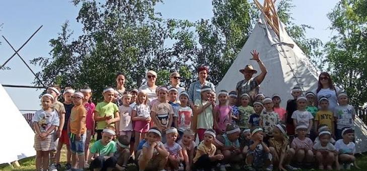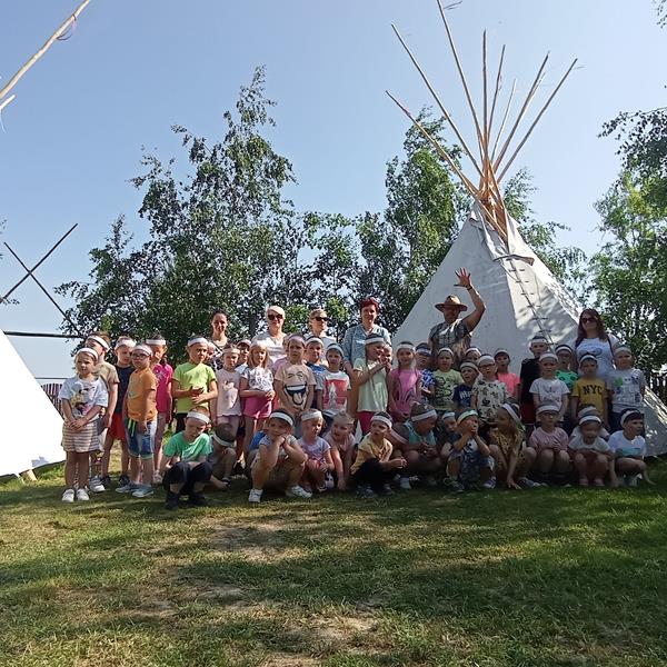 W piątek 02 czerwca dzieci z Zerówki i Średniaków pojechały na wycieczkę do Kunowej, aby aktywnie spędzić czas w Wiosce Indiańskiej Hokka Hey. Na miejscu czekało naprawdę wiele atrakcji. Było powitanie przez wodza Indian i zwiedzanie Mini ZOO. Po przejściu do wioski rozpoczęło się przygotowanie do spędzenia wolnego czasu - wyrabianie indiańskich opasek i malowanie twarzy na barwy wojenne, oglądanie oryginalnych tipi. Pamiątkowe zdjęcie, a po nim rozpoczęły się wspólne zabawy i gry z animatorem. Siły uzupełnił indiański poczęstunek. Atrakcje uzupełniły przejażdżki na konikach i zabawy na dmuchańcach. To był bardzo udany dzień.
