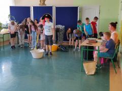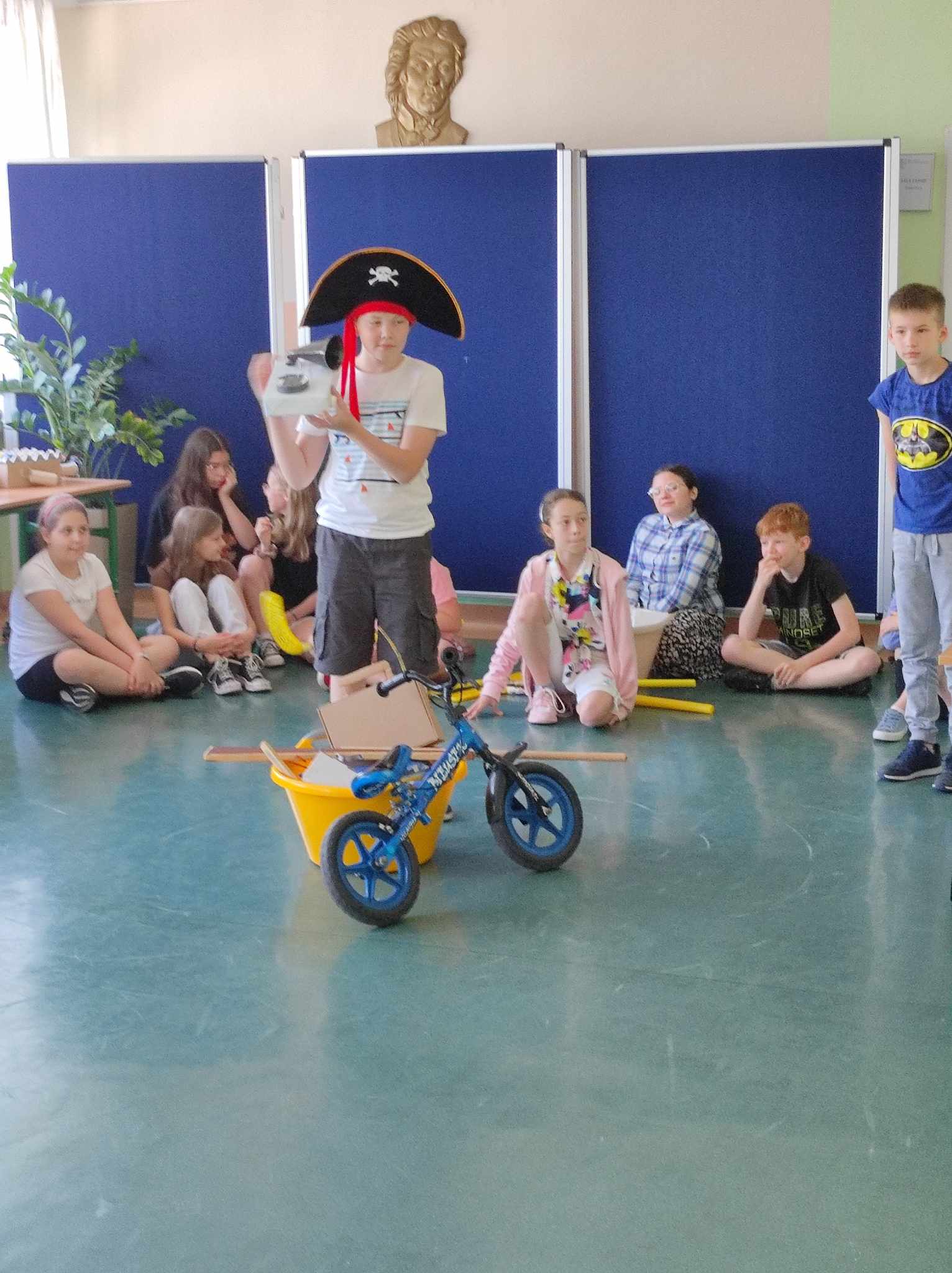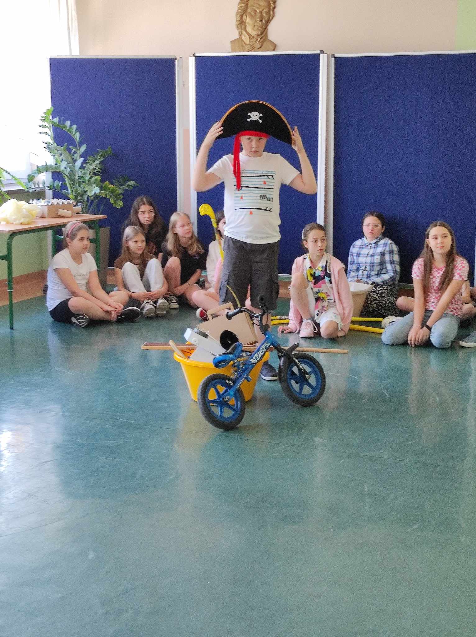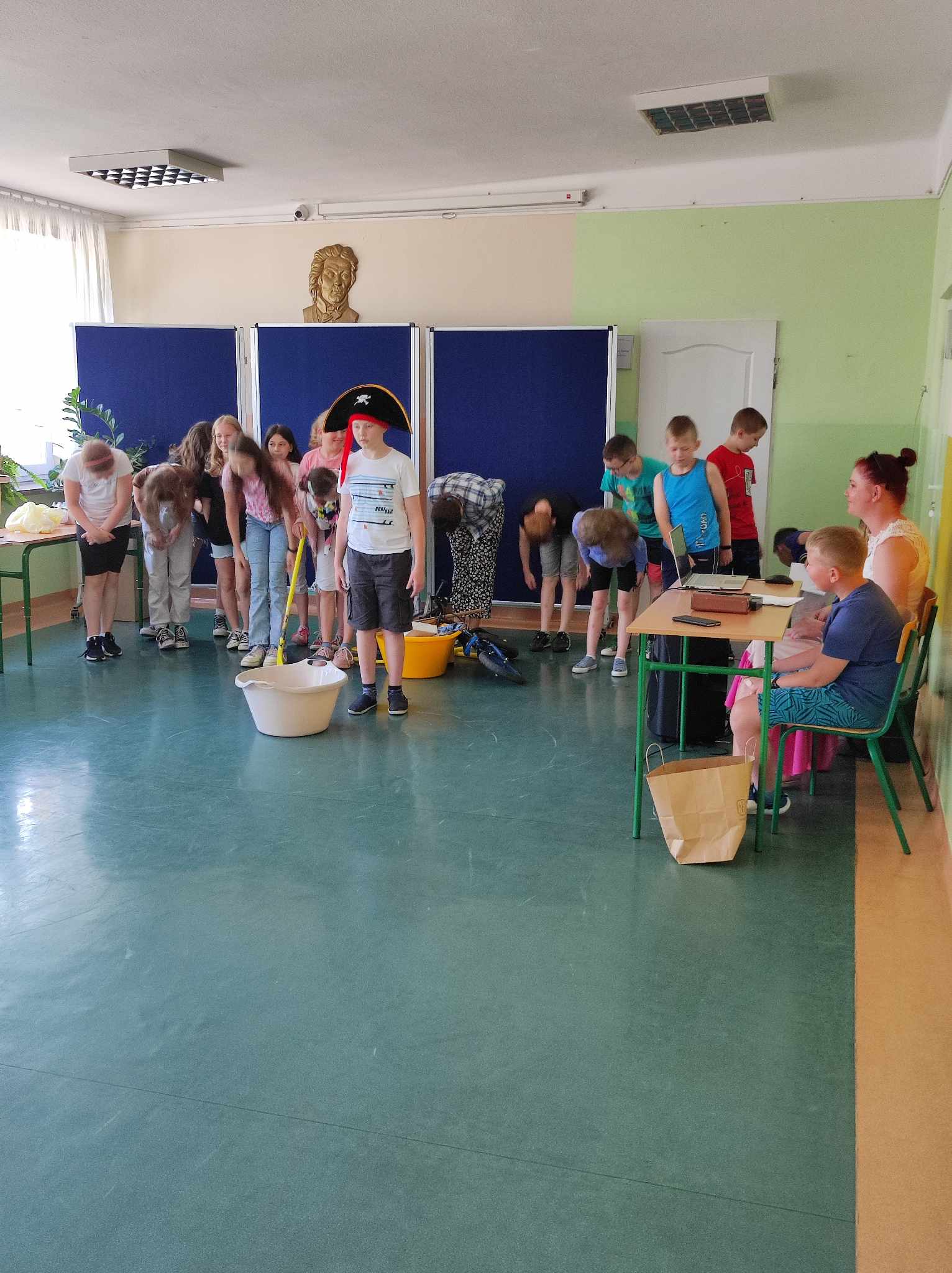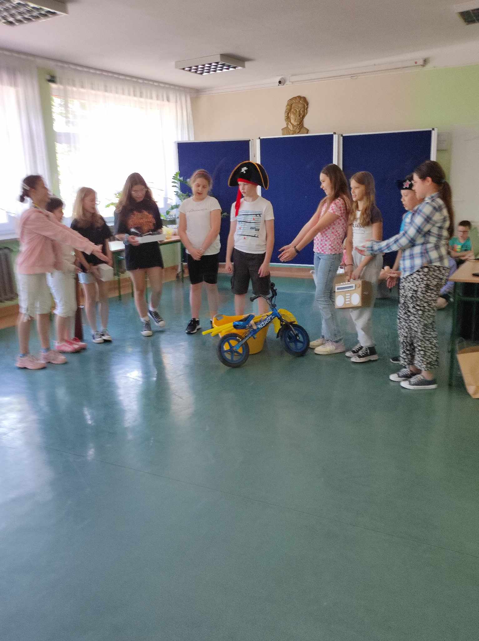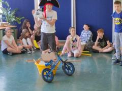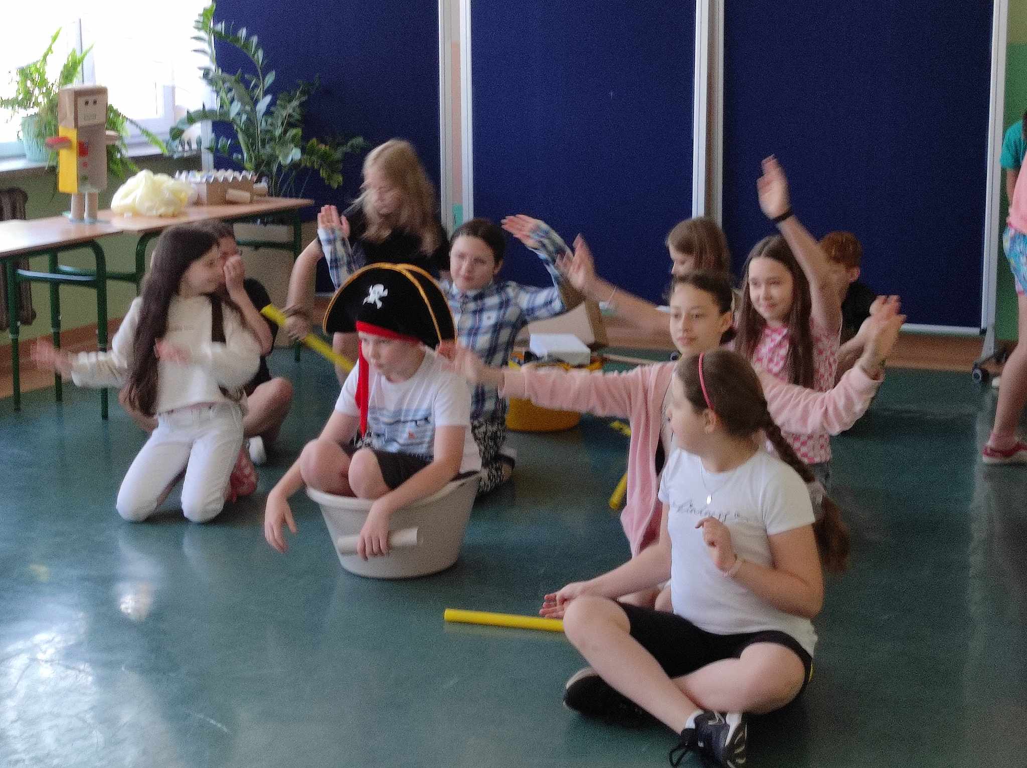 Uczniowie w roli aktorów w przedstawieniu "Pan Maluśkiewicz i wieloryb"