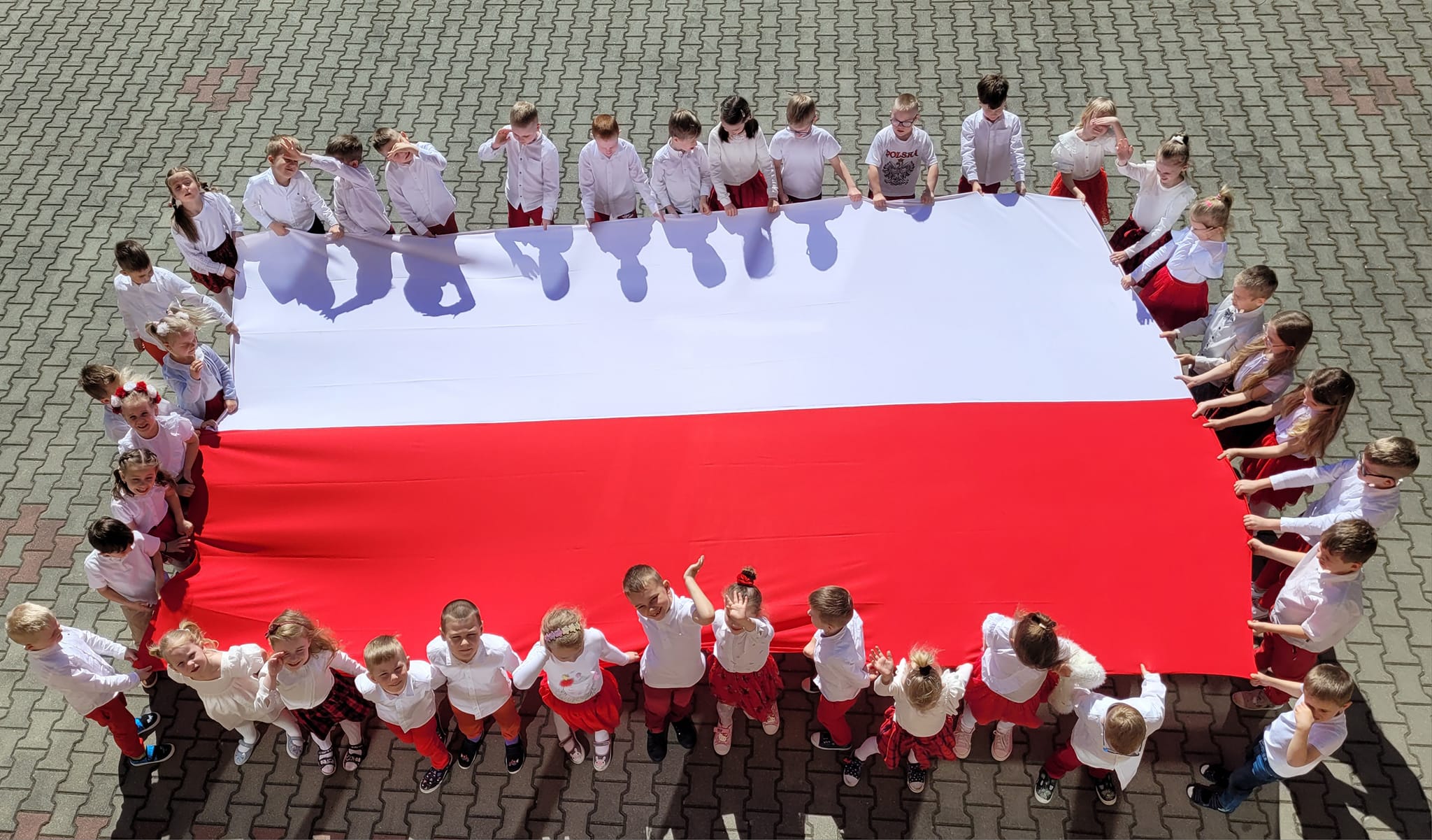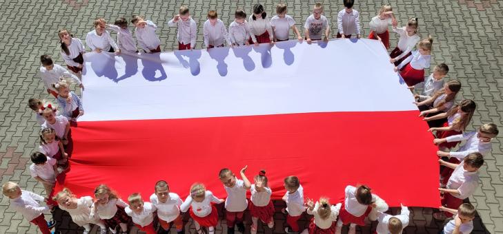 Na podsumowanie tygodnia rozmów o Polsce i naszych symbolach narodowych zorganizowano spotkanie pod hasłem „Przedszkolaki z biało- czerwoną”. Wszyscy, włącznie z nauczycielami, byli ubrani w biało-czerwone stroje, wyrażając tym samym swoją miłość do kraju. Obchody rozpoczęły się od odśpiewania hymnu narodowego. Nauczyciele opowiedzieli dzieciom o historii flagi i jej znaczeniu dla kraju. Dzieci przygotowały krótkie występy, w których prezentowały swoje umiejętności taneczne i wokalne, wyrażając jednocześnie swoją miłość do ojczyzny. Na zakończenie dnia wszyscy spotkaliśmy się wokół ogromniej biało- czerwonej na placu przed szkołą. To było wspaniałe i wzruszające przeżycie dla wszystkich.