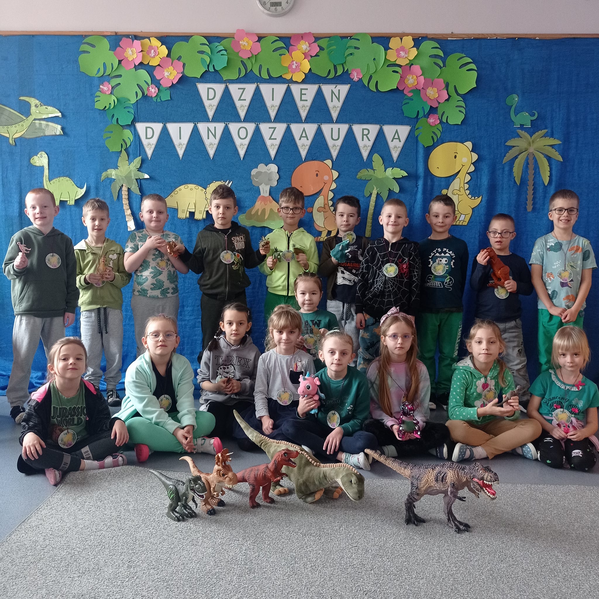 Dziś Starszaki obchodziły "Dzień Dinozaura". Poznały i utrwaliły wiadomości o dinozurach i prehistorycznym świecie. Atrakcjami przygotowanymi przez wychowawcę były poszukiwania skamielin w piasku - wykopaliska archeologiczne, obserwacja eksperymentu - wybuchu wulkanu. Dzieci chętnie opowiadały o swoich ulubionych dinozaurach, dzieliły je na mięsożerców i roślinożerców. Na koniec kązdy wykonał własnego diplodoka. To był bardzo energeryczny i wesoły dzień!