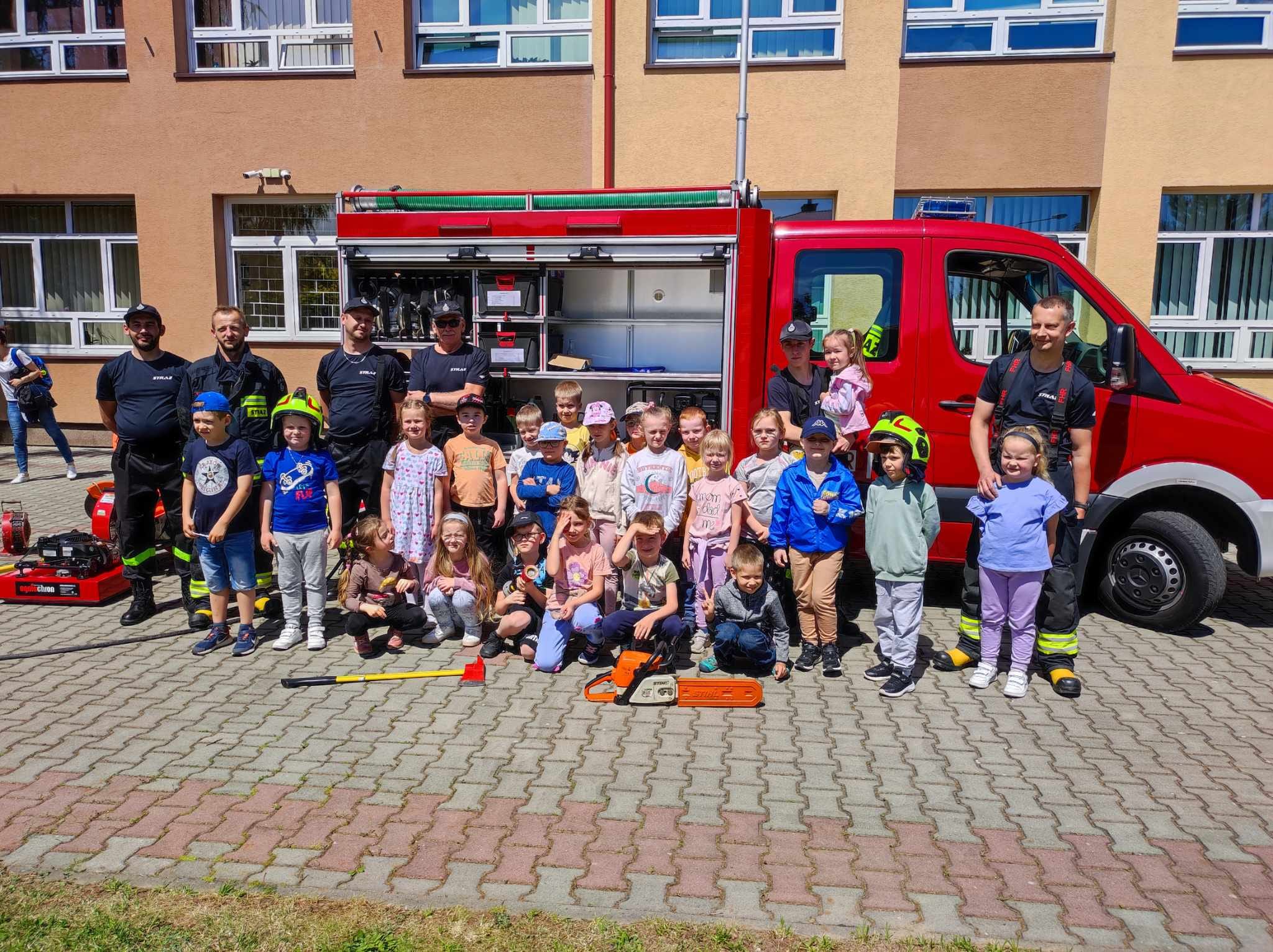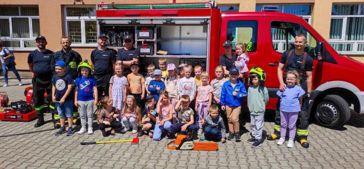 Dziś przedszkolaki spotkały się ze Strażakami z Ochotniczą Strażą Pożarną w Łężanach. Dzieci oglądały wóz strażacki i sprzęty używane w pracy strażaka, mogły posiedzieć za kierownicą oraz spróbować swoich sił w trzymaniu węża strażackiego i polewaniu wodą starszych kolegów. Radości było co niemiara! Na koniec otrzymały słodki upominek. Dziękujemy serdecznie naszym niezawodnym Strażakom za moc atrakcji.