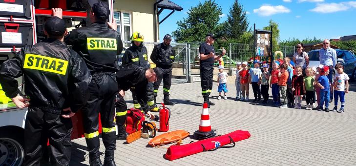 Dzisiejszego dnia grupa "Pszczółki" uczestniczyła w spotkaniu, podczas którego poznała specyfikę pracy strażaków, umundurowanie strażackie oraz niektóre sprzęty jakimi dysponują. Największe zainteresowanie wzbudził czerwony wóz strażacki, do którego dzieci mogły wejść. Ponadto miały okazję wypróbować swoich sił i zmierzyć się z prawdziwym wężem strażackim. Dziękujemy Ochotnicza Straż Pożarna w Łężanach za przybycie, słodki poczęstunek i wspaniale poprowadzone spotkanie. Uśmiech i radość dzieci bezcenne!
